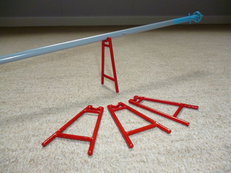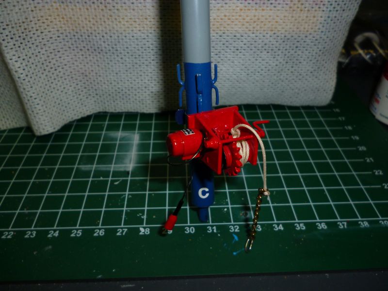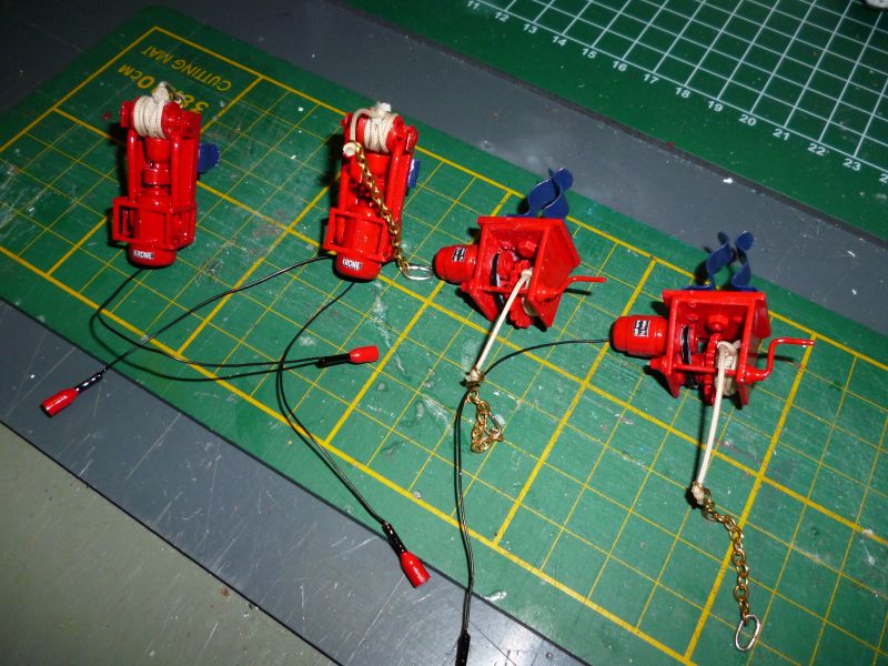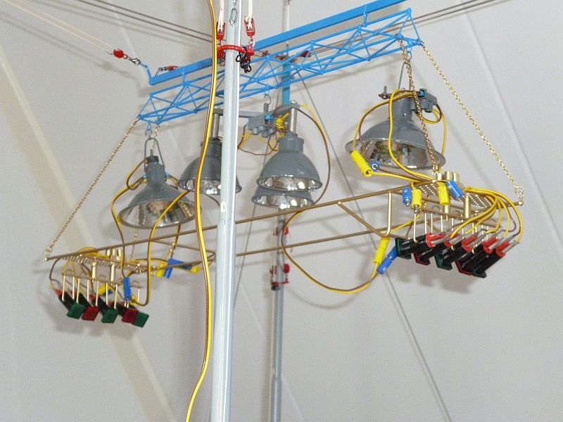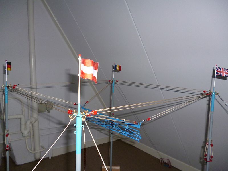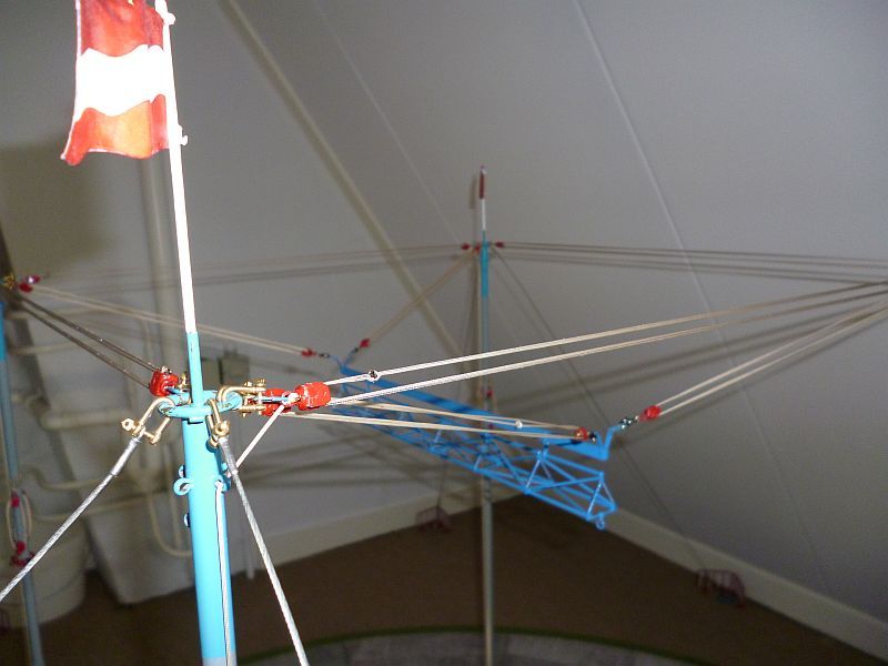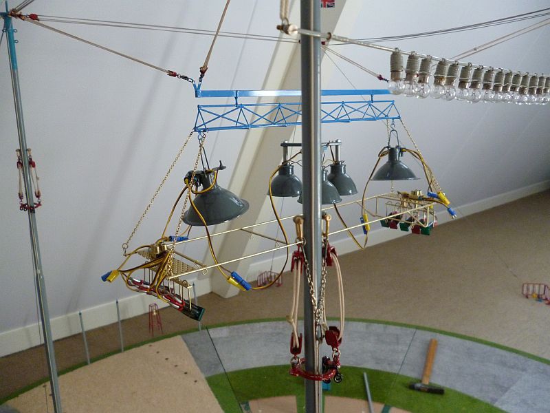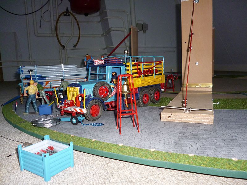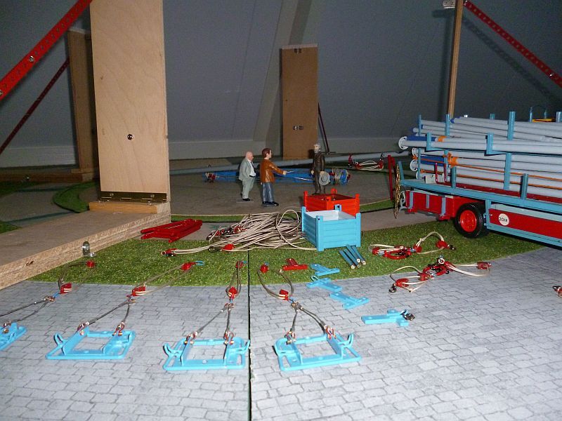 Bijna alles is uitgevoerd conform de werkelijkheid , stalen kabels ( fiets versnellingskabels ) alle benodigde katrollen met dubbele schijven , tirfor takels enz , alles kan gedemonteerd en in wagens verpakt.