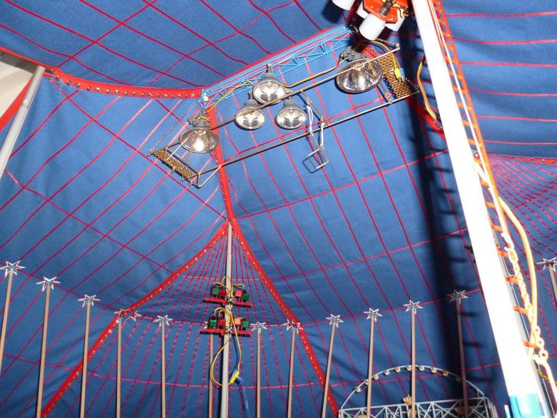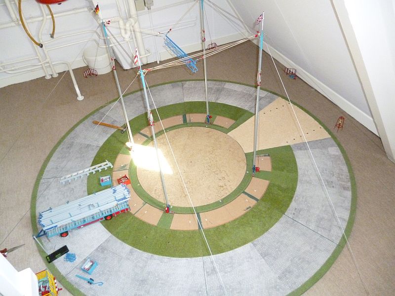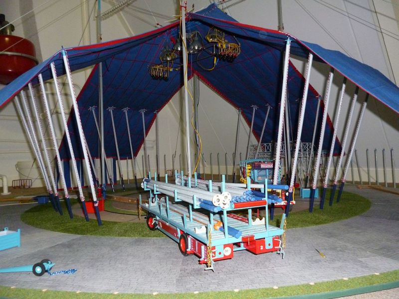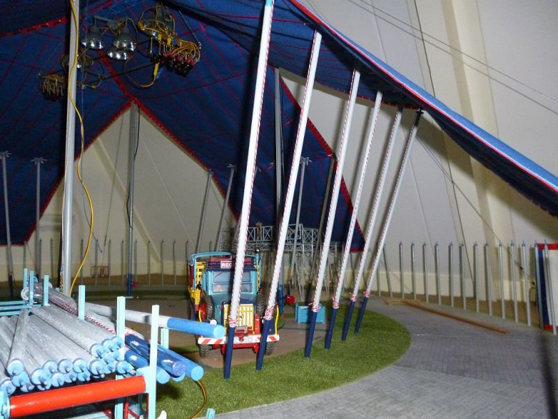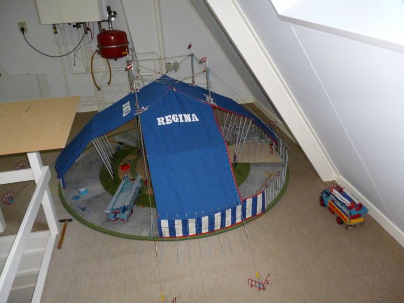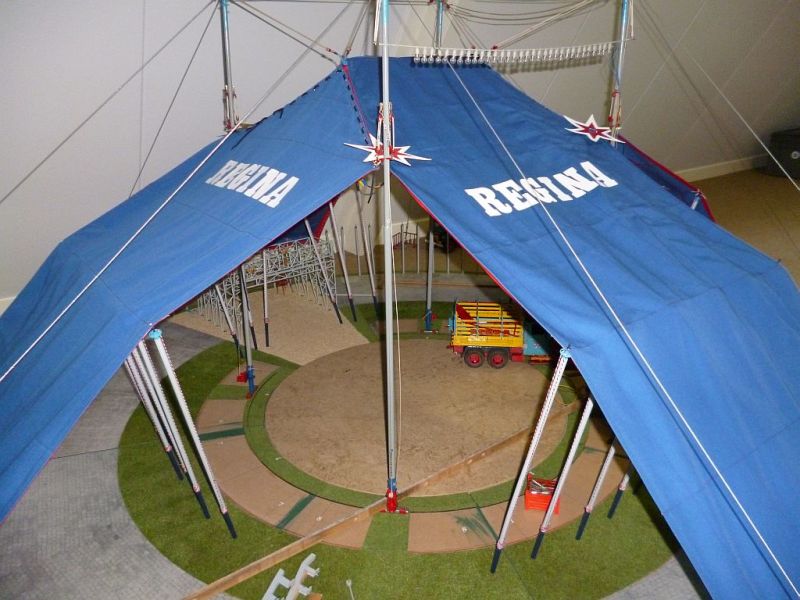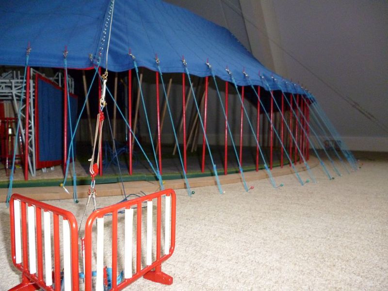 Omdat mijn circus gesitueerd is in de jaren 50 / 60 wordt het dus een tent , gemaakt uit doek met ronde stalen masten , houten quadrepoles en rondellstangen , de tent heeft een middellijn van 150 cm de masten zijn 60 cm hoog , de zijkant 20 cm , in werkelijkheid dus 30 , 12 en 4 meter.
