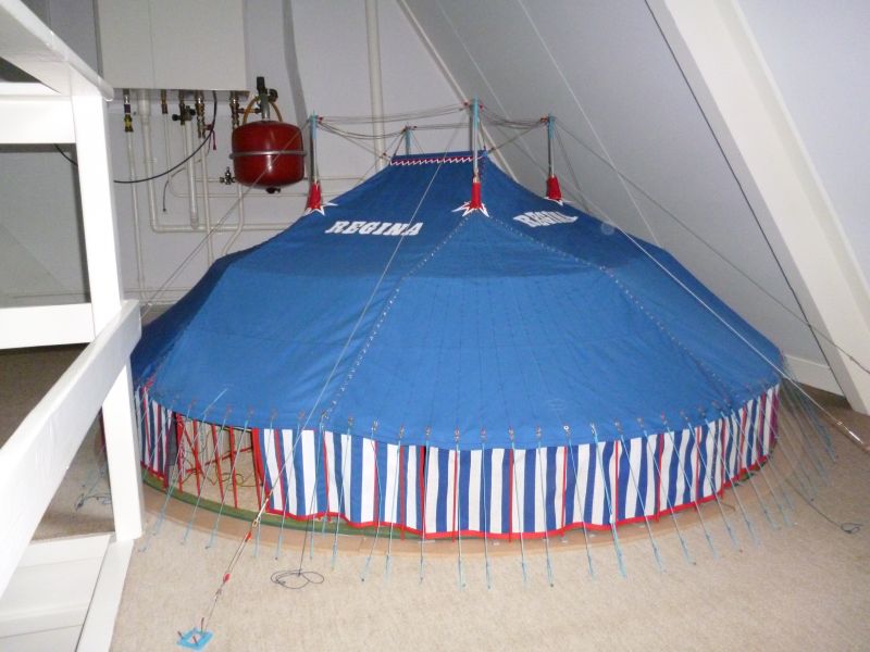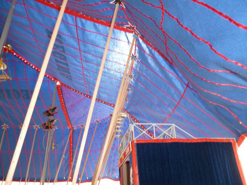 Begin 2014 ben ik begonnen met de bouw van een nieuwe chapiteau , dat is het franse woord voor circustent , aangezien circus internatonaal is worden veel onderdelen in verschillende talen benoemd , zo worden de stormpalen die halverwege de tent het dak ondersteunen quadrepoles genoemd , maar de palen die rondom de tent het zeil ondersteunen heten rondellstangen.
